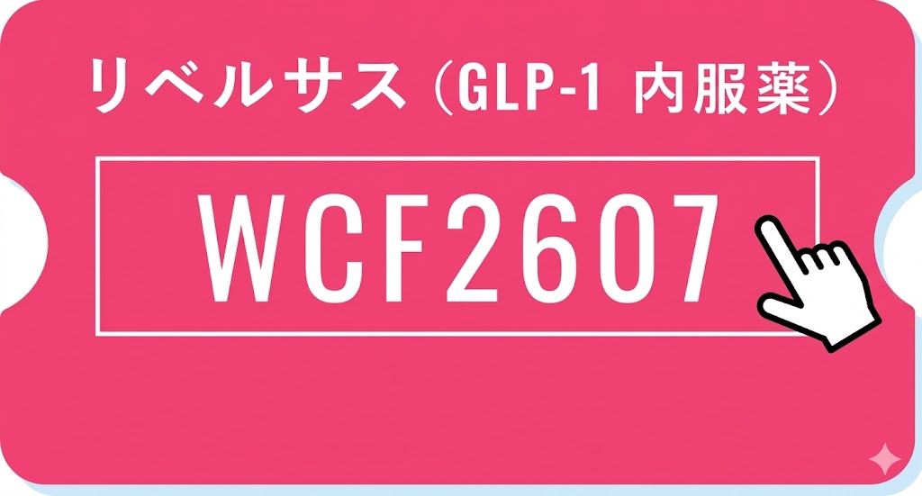 ※3 リベルサス錠3mg6ヶ月定期から1ヶ月あたりの金額を算出し、決済画面でクーポンコード「WCF2607」を 入力した場合の金額。2ヶ月目以降8,027円。別途配送料550円